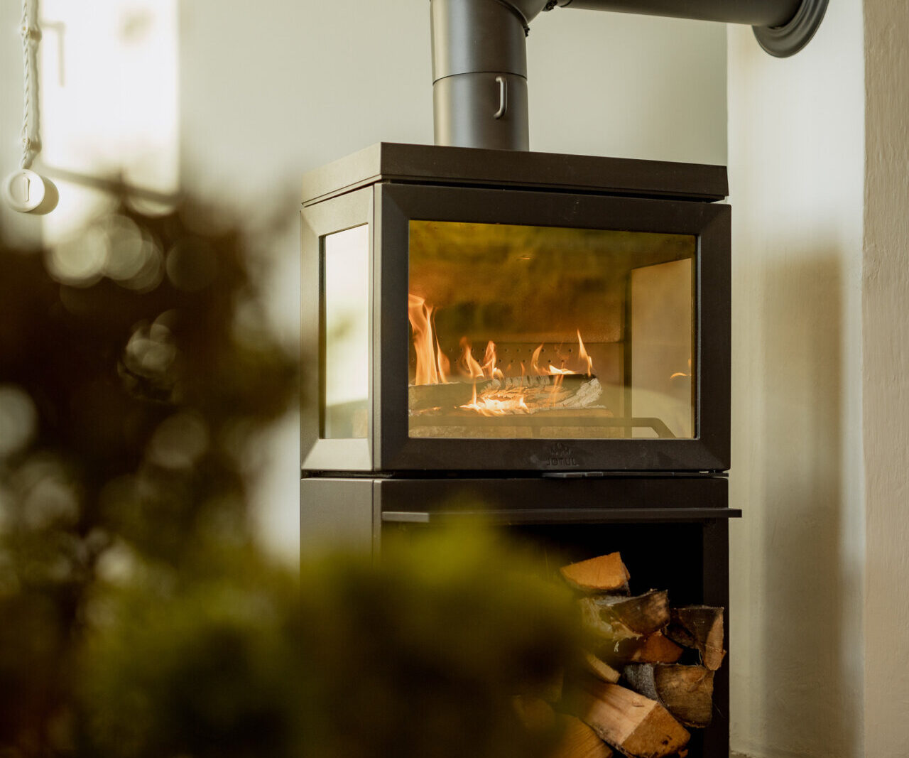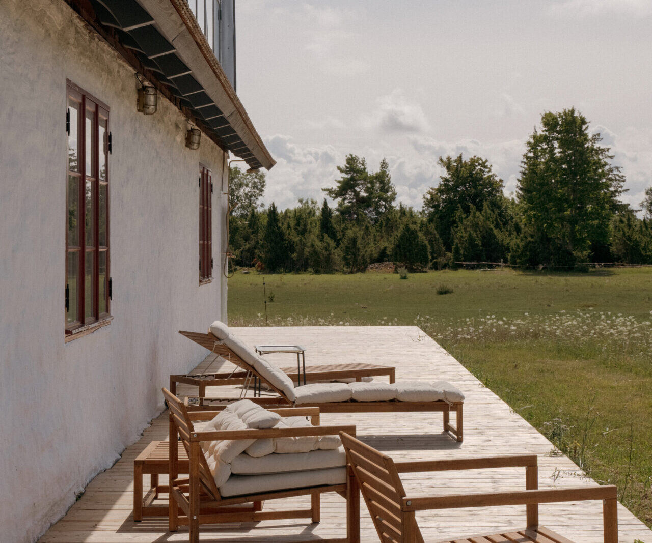 One of the bedrooms has a wood burning stove as well as direct access to the front garden and terrace at the back. The first floor bedroom has endless views overlooking the apple orchard, the lakes and the baltic sea.